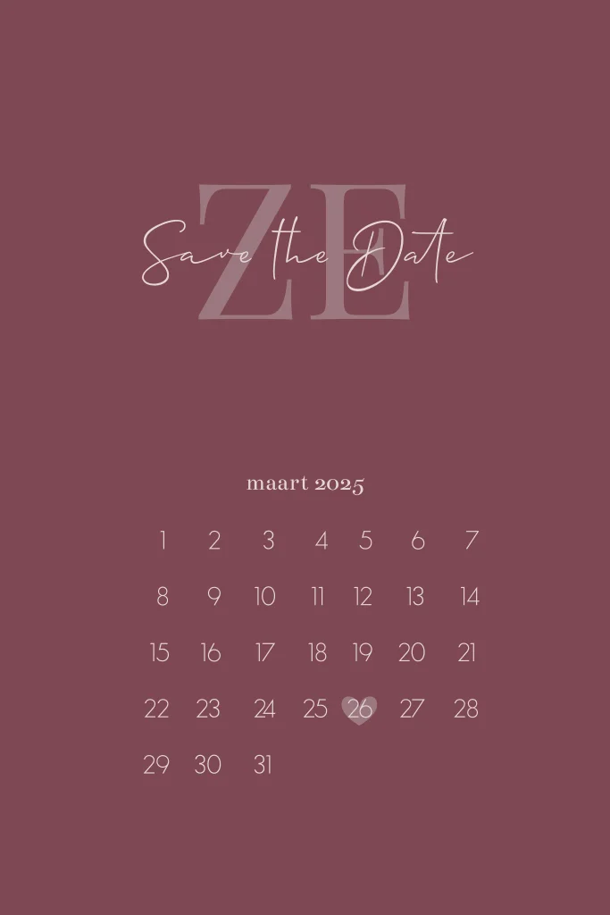 Een stijlvolle Save The Date kaart met een trendy paarse kleur en kalender zodat alle aandacht naar de trouwdatum gaat. Pas verschillende elementen gemakkelijk aan.