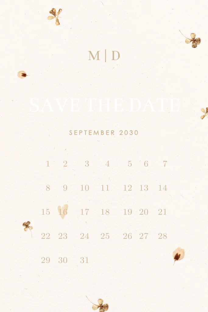 Deze Save the Date kaart heeft prachtige geperste bloemen in een gele kleur. De kalender zorgt ervoor dat alle aandacht gaat naar jullie trouwdatum.