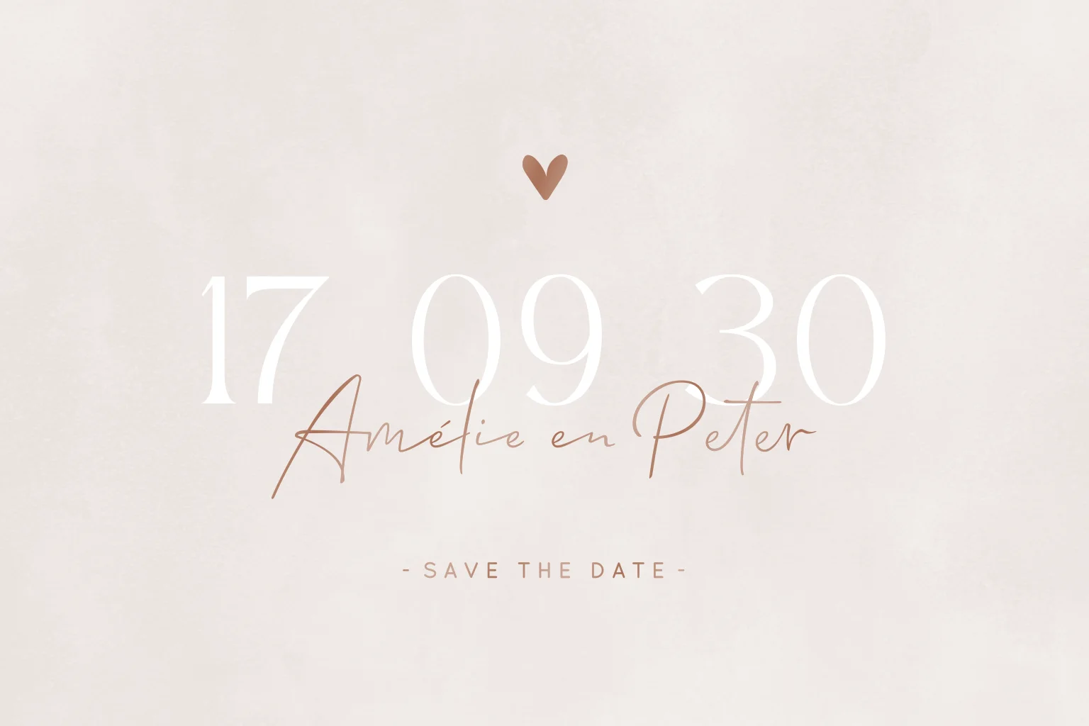 Minimalistische Save The Date kaart in neutrale tinten met letters in hoogglans. Personaliseer naar wens in onze online editor.