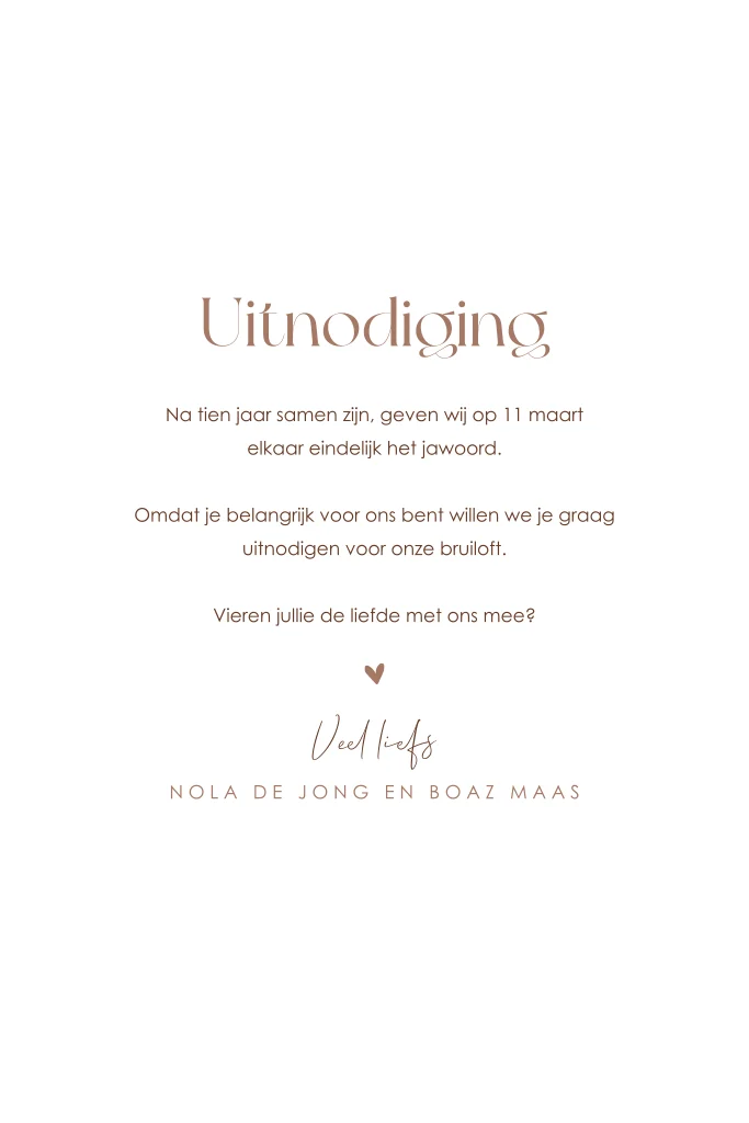 Jullie gaan trouwen! Reden voor een feestje. Nodig jullie gasten uit met deze prachtige trouwkaart! Je past kleuren, lettertypes en andere elementen gemakkelijk aan met de online editor.