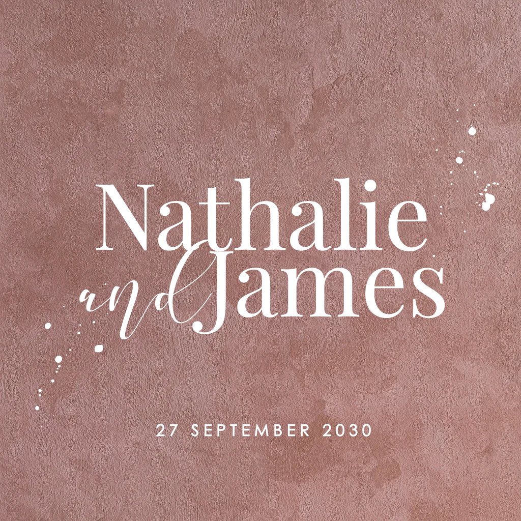 Stijlvolle trouwkaart in een oudroze trendkleur. De namen, spetters en datum worden gedrukt in roséfolie. Dat maakt het kaartje extra bijzonder!