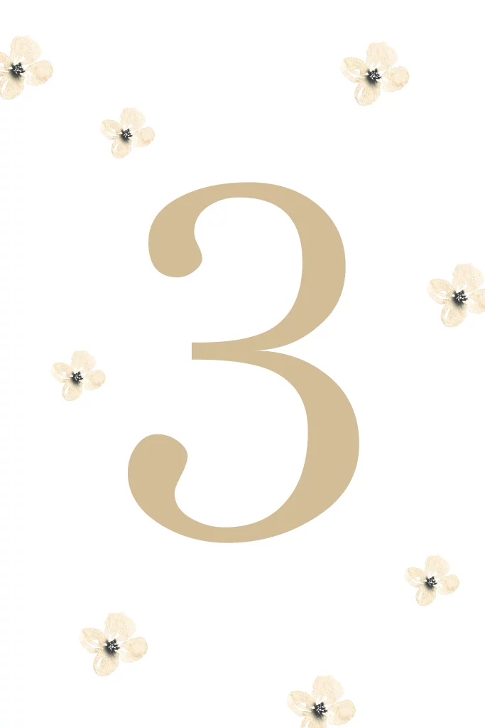 Maak de tafelsetting op jullie bruiloft compleet en bestel tafelnummers in de stijl van jullie trouwkaart. Hoe leuk zijn deze tafelnummers in neutrale kleuren met lentebloemen?