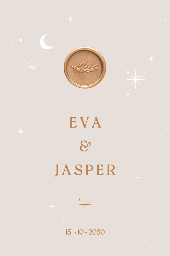 Zo dreamy, deze celestial trouwkaart in beige! Kies heel eenvoudig afbeeldingen uit onze beeldbank. Voeg eigen tekst toe en maak een unieke trouwkaart.