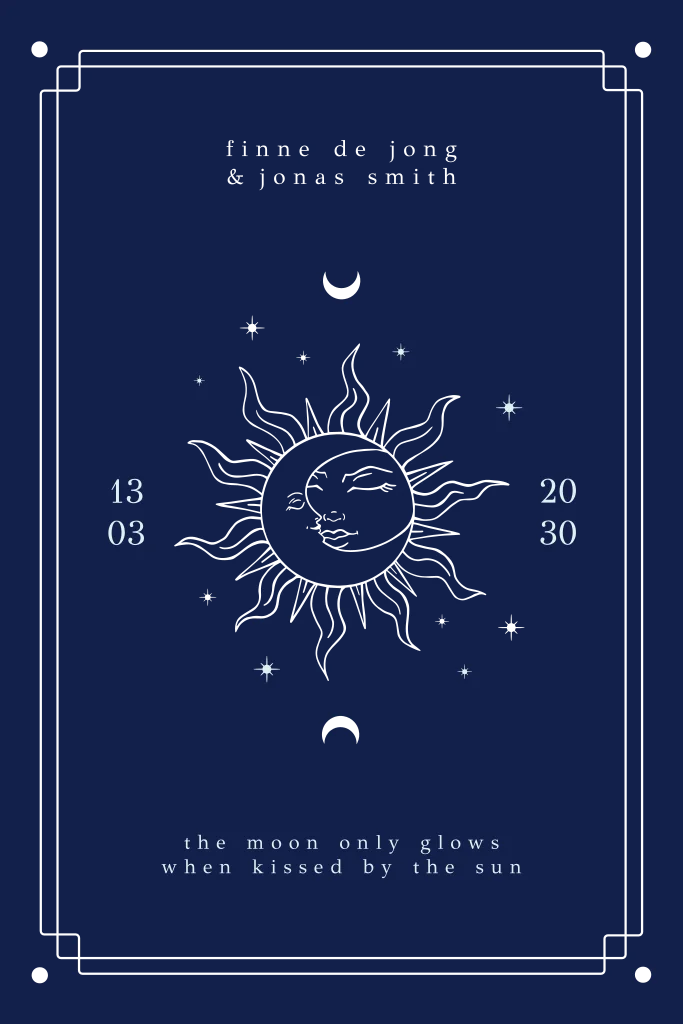 Zo dreamy, deze donkerblauwe celestial trouwkaart met goudfolie! Kies heel eenvoudig afbeeldingen uit onze beeldbank. Voeg eigen tekst toe en maak een unieke trouwkaart.