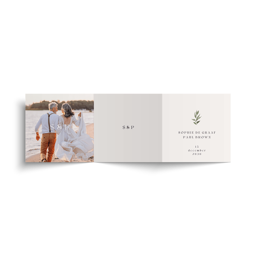Trouwkaart drieluik met foto en olijftakjes