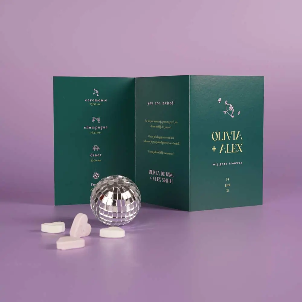 Wat een pláátje, deze trendy groene trouwkaart met roze typografie! Je kunt de kaart omvouwen tot drieluik, zo heb je een extra originele zigzag trouwkaart.
