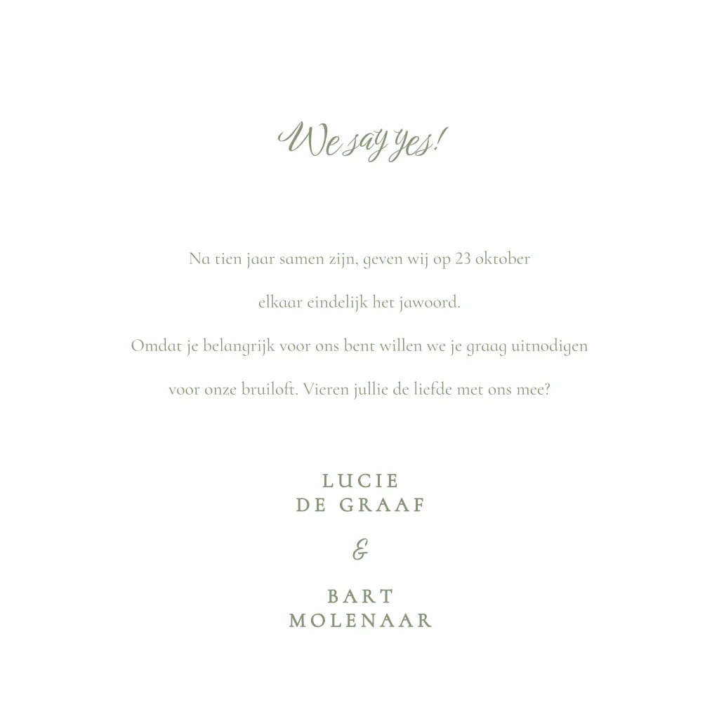 Gaan jullie binnenkort trouwen en zijn jullie op zoek naar een klassieke trouwkaart? Deze groene kaart met sierlijke initialen is niet alleen elegant, maar ook tijdloos. Iets aanpassen? Dat doe je gemakkelijk met de online editor.