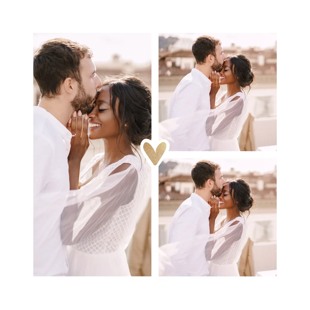 Ontwerp je eigen fotokaart. Vervang heel eenvoudig de voorbeeld foto's voor foto’s van jullie eigen loveshoot en maak de kaart uniek door het toevoegen van afbeeldingen uit onze beeldbank.