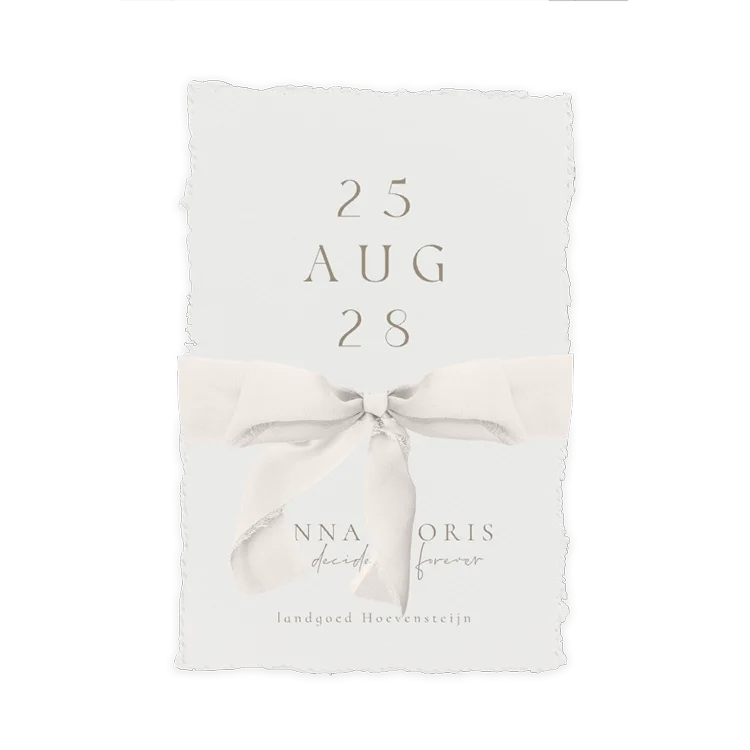 Trouwkaart handgeschept papier look minimalistisch met zijden lint