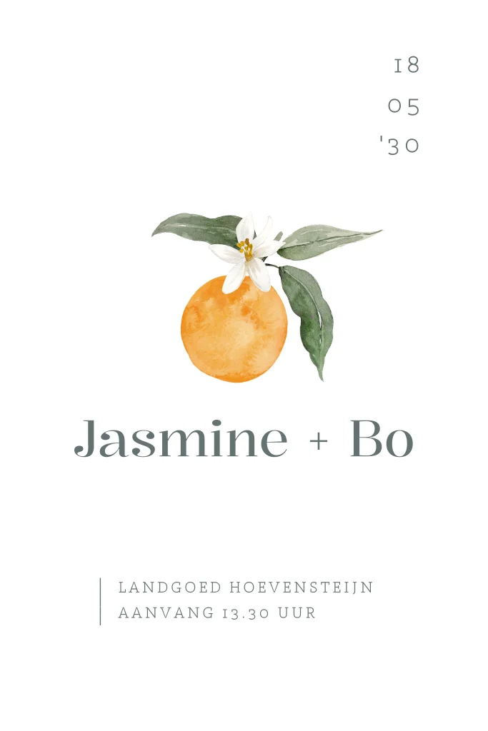 Gaan jullie trouwen? Gefeliciteerd! Deze trouwkaart met handgeschilderde sinaasappelbloesem past perfect bij jullie lente of zomer bruiloft. Iets aanpassen of toevoegen? Dat doe je gemakkelijk met de online editor.