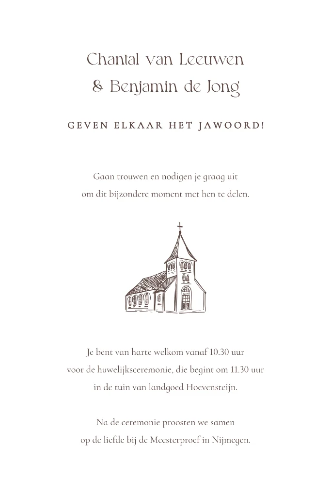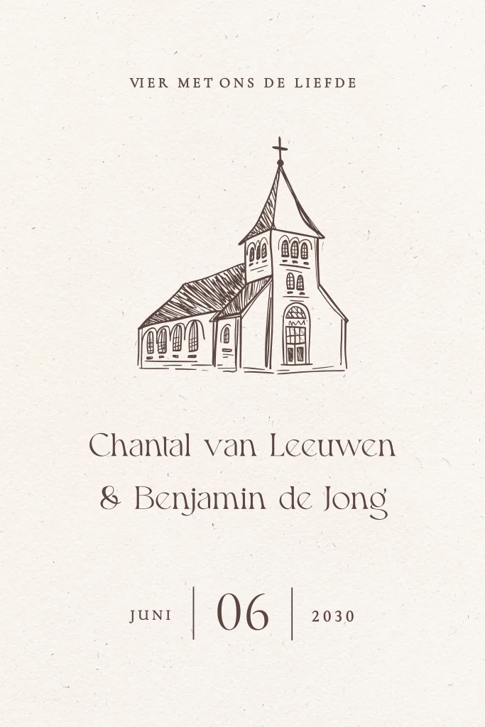 Gaan jullie voor een traditionele huwelijksceremonie in een kerk? Nodig jullie gasten dan uit met deze prachtige klassieke trouwkaart met illustratie van een kerk en neutrale kleuren. Je kunt de kaart volledig aanpassen met de online editor. Zo mooi!