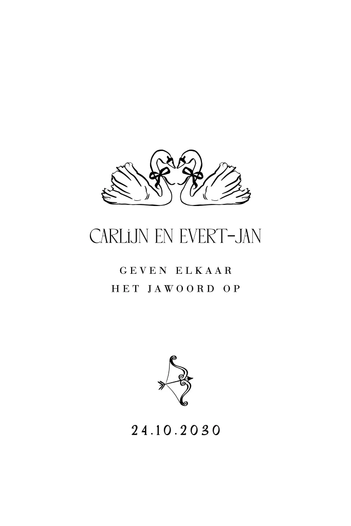 Jullie gaan trouwen, yes! Deze trouwkaart met zwart wit illustraties is perfect voor wie op zoek is naar een elegante trouwkaart met simpel design. Pas gemakkelijk zelf de kleuren, lettertypes en andere elementen aan met de online editor.