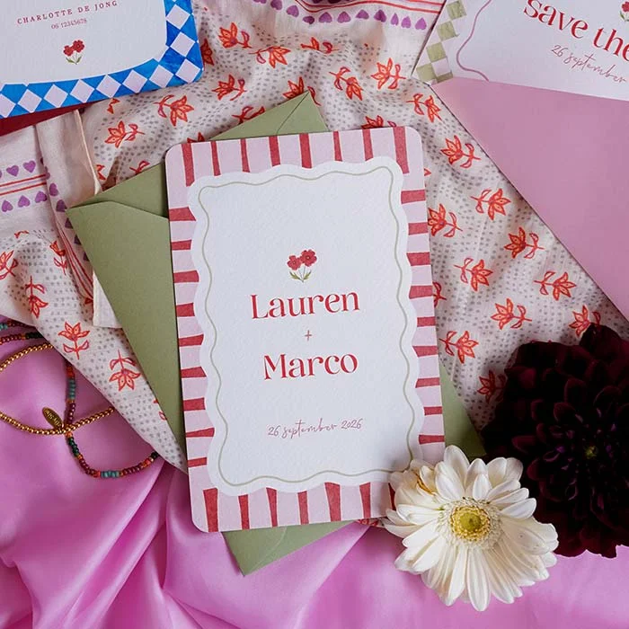 Deze trouwkaart maakt deel uit van een complete set in deze stijl.