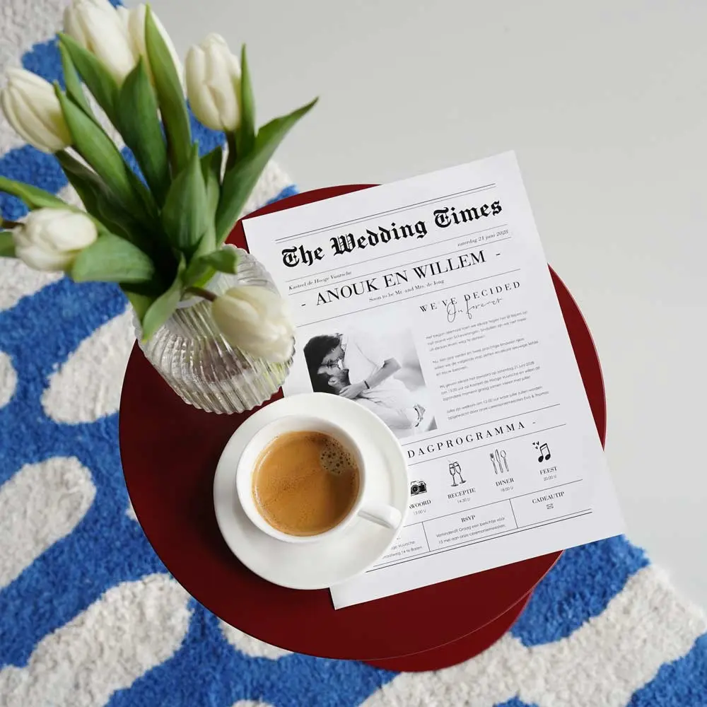 Zo gaaf: een trouwkaart in de vorm van een krant! Kondig jullie trouwdag aan met deze gepersonaliseerde trouwkrant. De krant is A4 formaat en wordt dubbelzijdig bedrukt. Iets aanpassen? Dat doe je gemakkelijk met de online editor. Tip: Vouw de krant dubbel en knoop er een mooi lint omheen voor een extra luxe uitstraling.