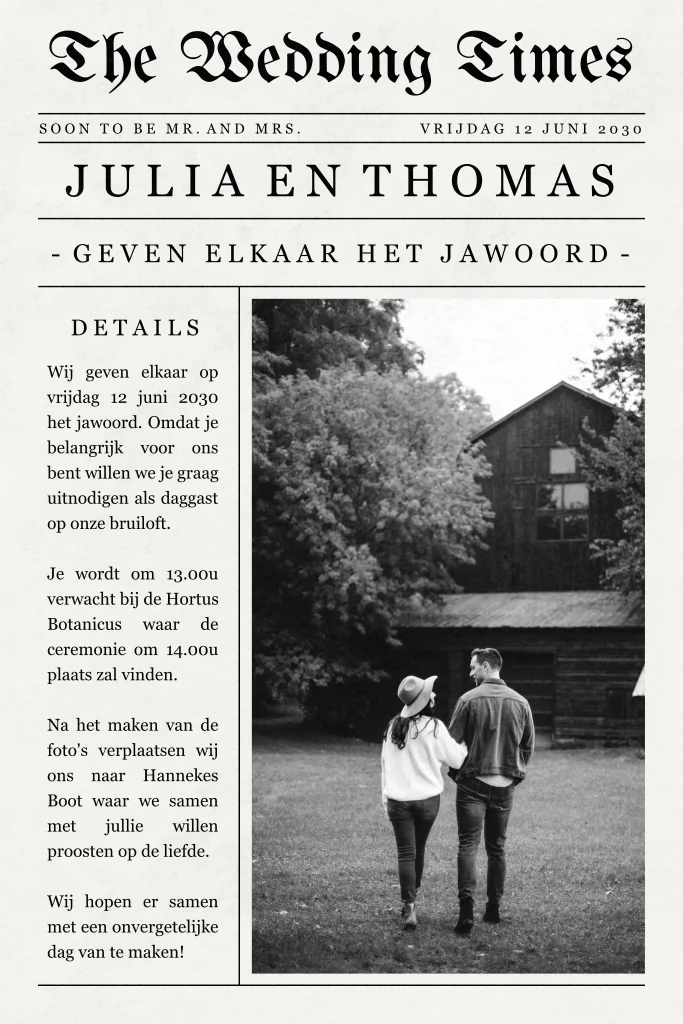 Stijlvolle trouwkaart in krantenstijl, perfect voor jullie grote dag. Personaliseer eenvoudig in onze online editor.