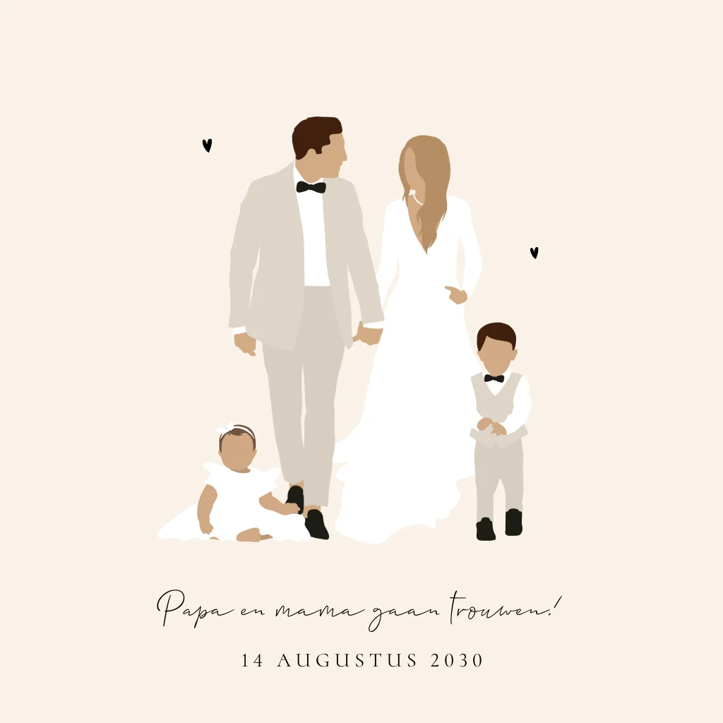 Bij een speciale aankondiging hoort een speciale uitnodiging. Wat dacht je van dit kaartje met faceless illustratie.. Zo leuk! Kleuren en haren passen we kosteloos voor je aan. Wil je liever een eigen persoonlijke illustratie? Vraag een illustratie op maat aan via onze studio pagina.