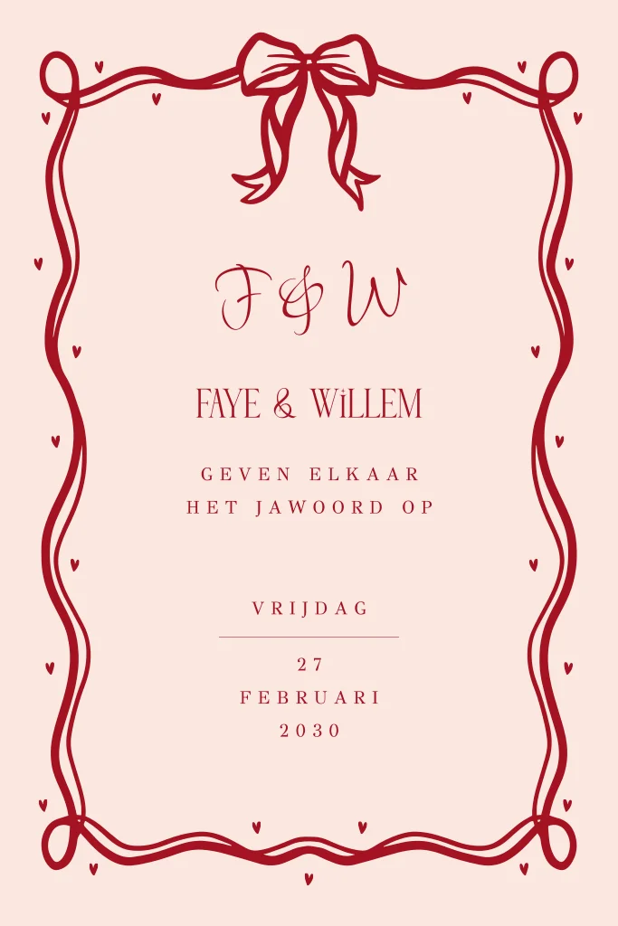 Zo romantisch, deze roze met rode retro trouwkaart met strik en hartjes! Combineer de kaart met een envelop in metallic rood en pas de teksten aan met de online editor. Plaatje, toch?