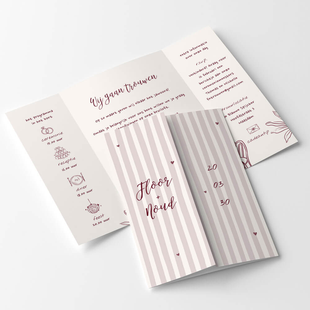 Wauw, wat is dit een gave trouwkaart! Deze kaart met theatervouw heeft een tof rood streepjes patroon met mooie, rode illustraties. Pas kleuren en typografie naar wens aan in de editor en bestel een proefdruk!