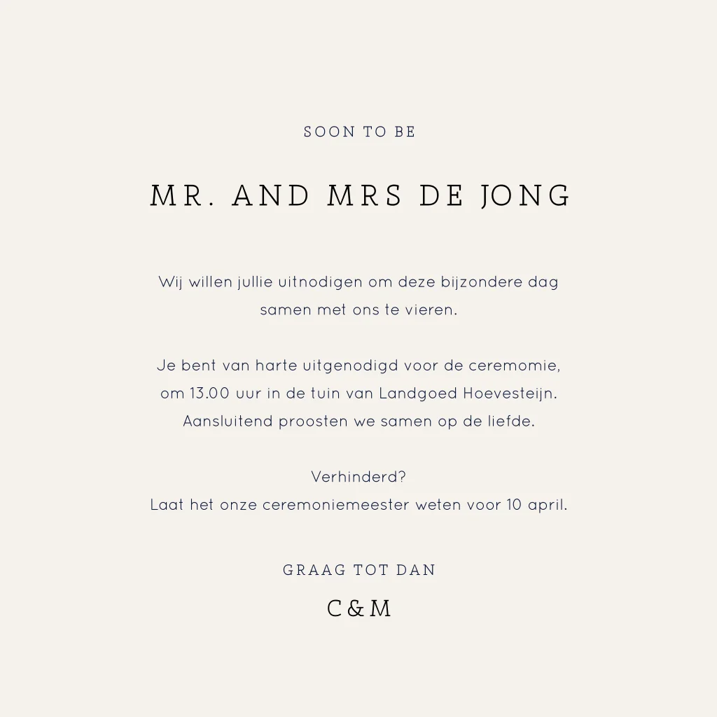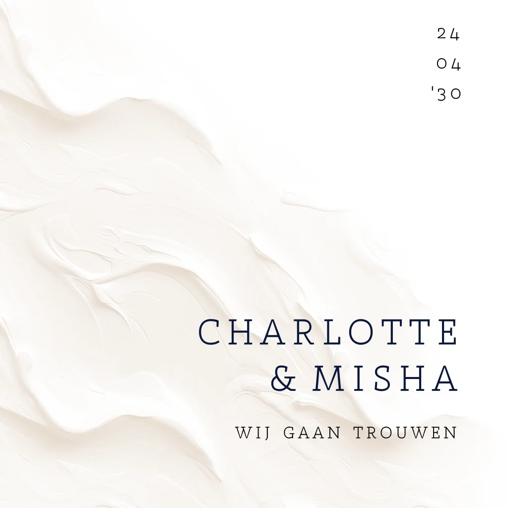 Hoe mooi is deze trendy crèmekleurige trouwkaart met verf effect? Pas kleuren en typografie naar wens aan in de editor en bestel een proefdruk.