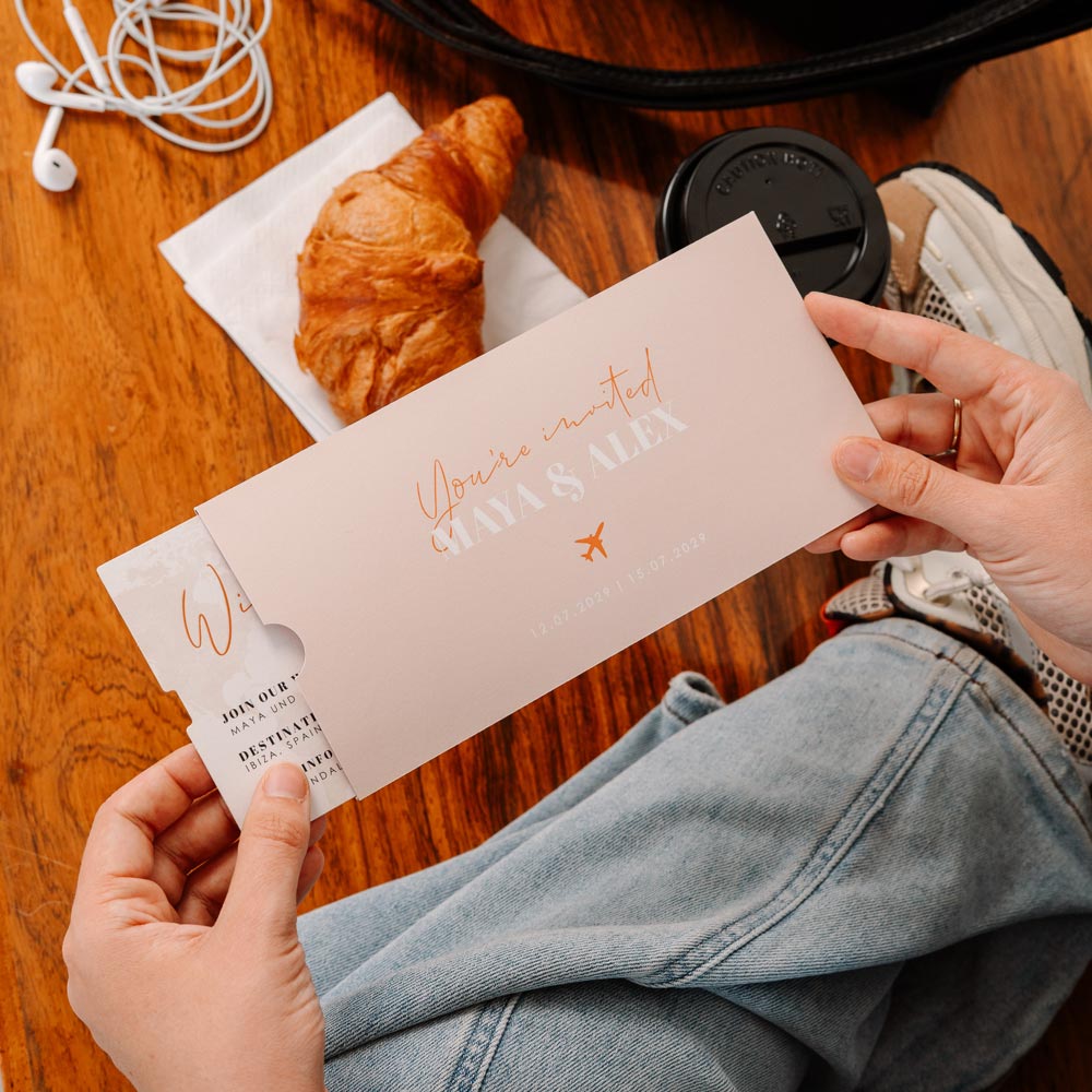 Trouwkaart in de vorm van een vliegticket met koperfolie