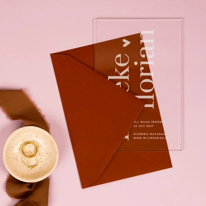 Een stijlvolle trouwkaart met hartje. Pas kleuren en typografie naar wens aan in de editor en bestel een proefdruk.Gedrukt op helder transparant acryl, ook wel plexiglas genoemd, van 2 mm dik.