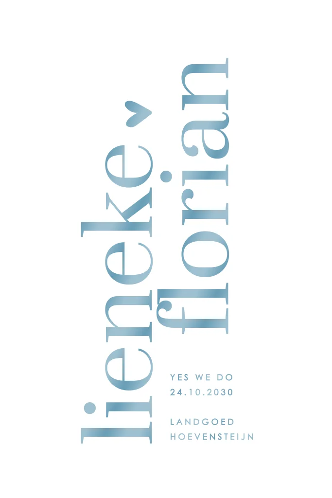 Kies een trouwkaart met blauwe hoogglans afwerking en maak deze kaart helemaal eigen. Pas kleuren en typografie naar wens aan in de editor en bestel een proefdruk.