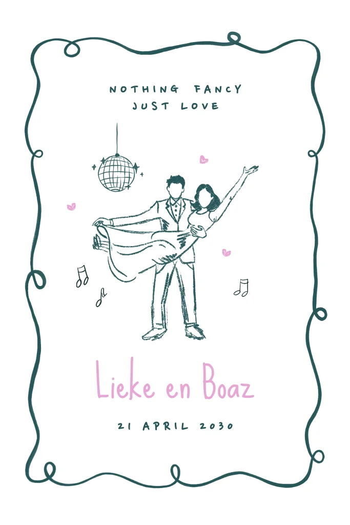 Een vrolijke trouwkaart met een illustratie van een dansend bruidspaar. Het kader geeft deze kaart een speelse uitstraling. Personaliseer jullie uitnodiging eenvoudig in onze online editor.