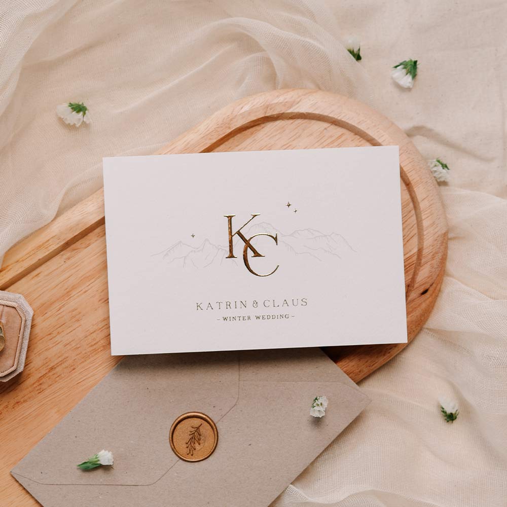 Elegante trouwkaart voor jullie winterse bruiloft. De kaart heeft een mooi design met getekende bergen en prachtige foliedruk voor een luxe finish. Pas het ontwerp aan in onze online editor.