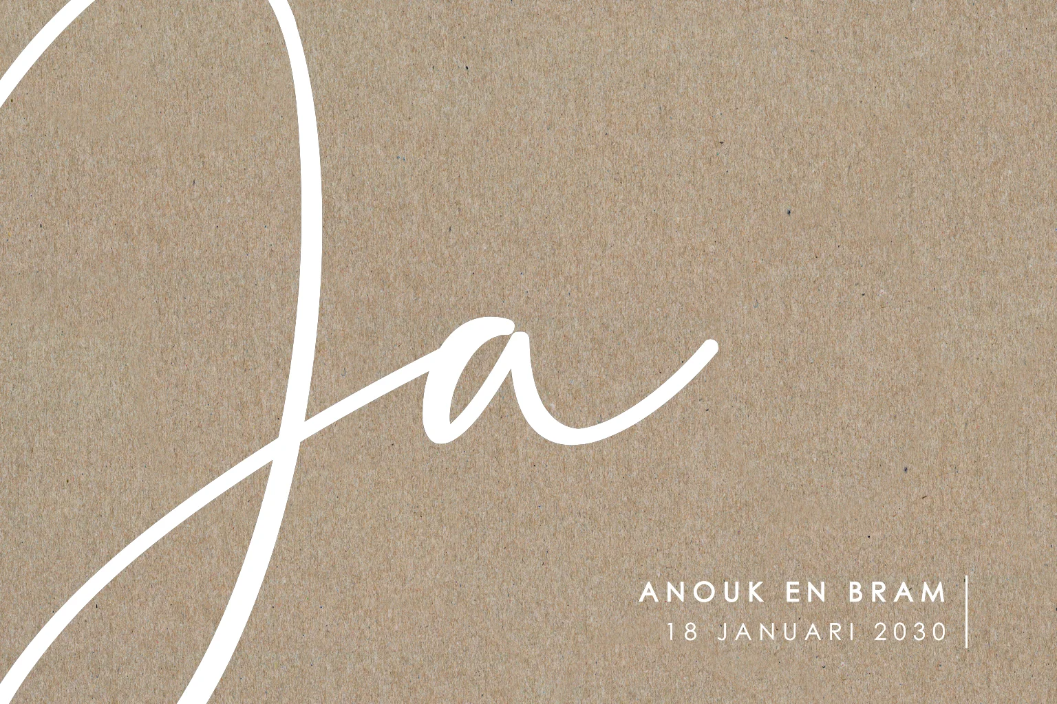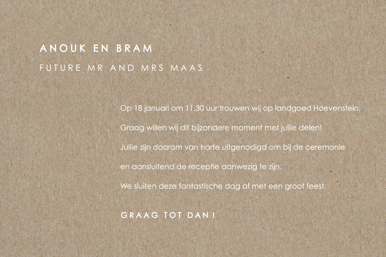 Bekijk hier alle trouwkaarten op kraft. Wil je jouw eigen ontwerp op kraft? Neem dan contact op met deHet kaartje wordt gedrukt op écht kraft papier. Dit heeft invloed op het design.Plaats zelf de teksten en elementen eenvoudig op de juiste plek in onze opmaaktool. Heb je hier hulp bij nodig? Neem gerust even contact met ons op!