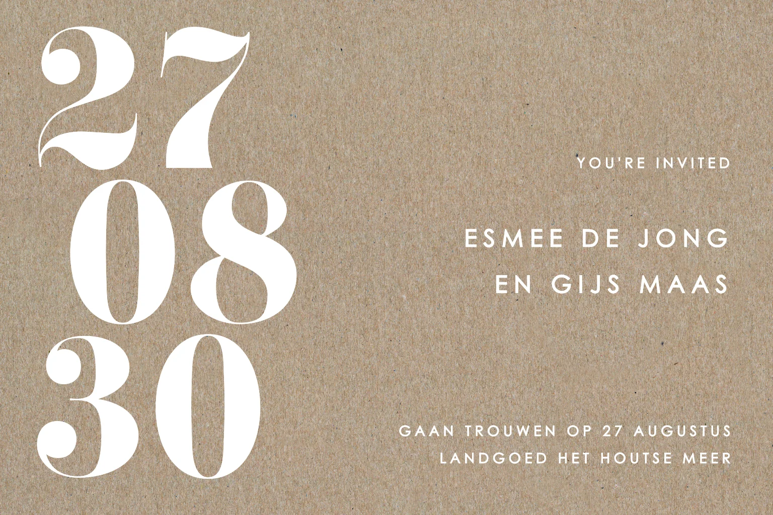Stijlvolle trouwkaart gedrukt op met datum groot.Het kaartje wordt gedrukt op écht kraft papier. Dit heeft invloed op het design.