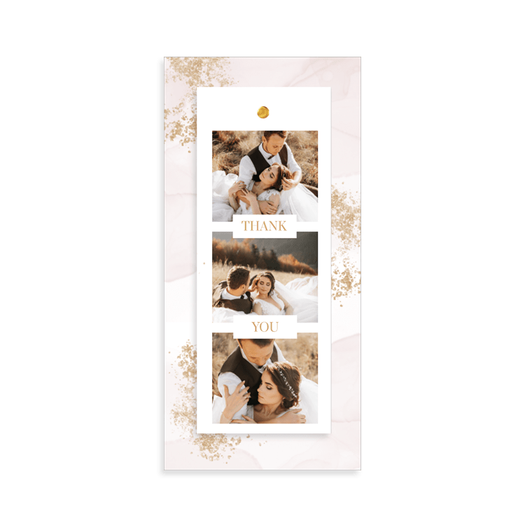 Ben je op zoek naar een mooie bedankkaart voor jullie bruiloft? Kies voor deze romantische labelkaart met roze watercolour, goudlook en fotostrip. De labels bevestig je door middel van een splitpen. Pas kleuren en typografie naar wens aan in de editor en bestel een proefdruk.