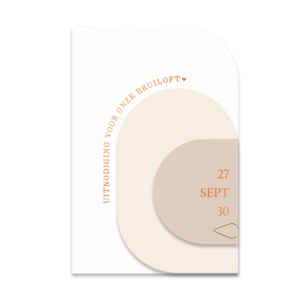 Een unieke trouwkaart bestaande uit meerdere losse kaarten in beige tinten, zo mooi! Pas kleuren en typografie naar wens aan in de editor en bestel een proefdruk.