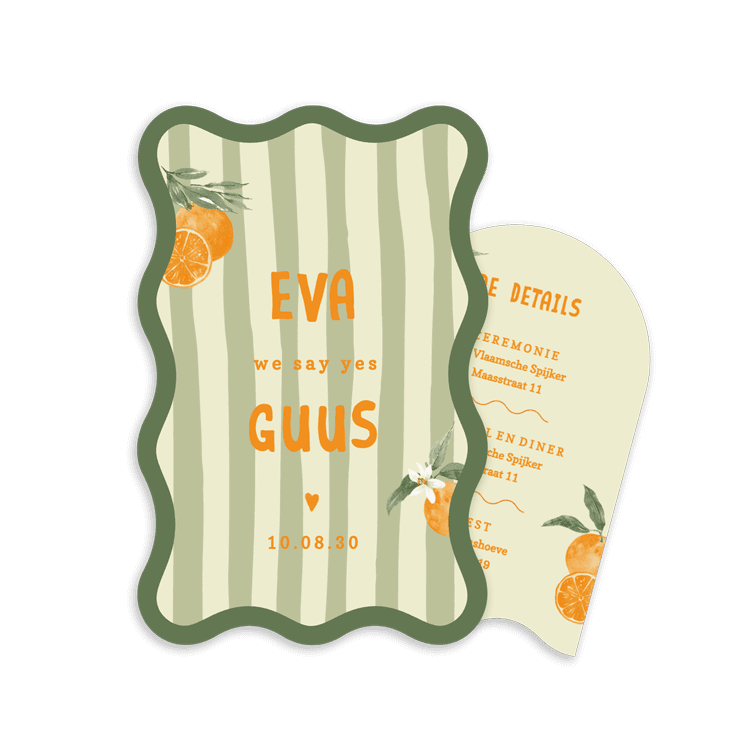 Hoe gaaf is deze trouwkaart in zomerse kleuren! Het groen en oranje zorgen voor een unieke en trendy uitstraling, perfect voor een zomerbruiloft. Maak de kaart extra persoonlijk door 'm naar wens te bewerken in de online editor.