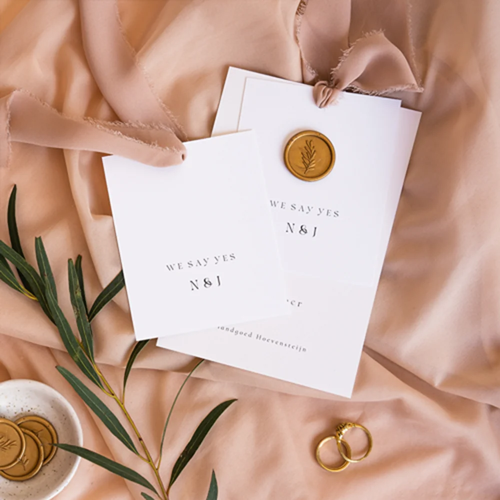 Goed om te weten: het zijden lint en de lakzegels worden niet standaard meegeleverd, deze kun je zelf toevoegen tijdens het bestelproces. Je vindt alle bevestigingsmaterialen hier en lakzegels hier.