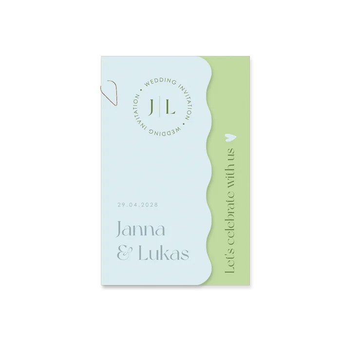 Een trendy trouwkaart bestaande uit meerdere losse kaartjes in licht blauw en licht groene kleuren. Wat een plaatje! Pas kleuren en typografie naar wens aan in de editor en bestel een proefdruk.