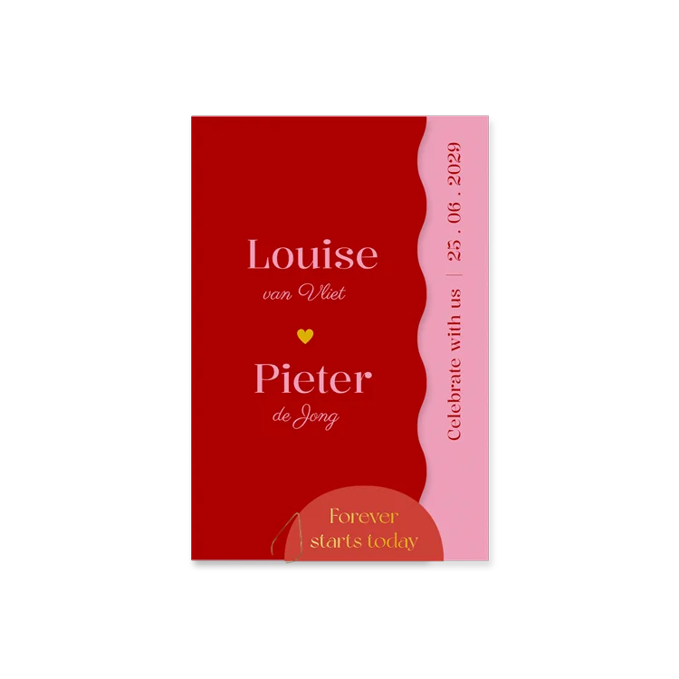 Trouwkaart labelkaart roze en rood met goudfolie