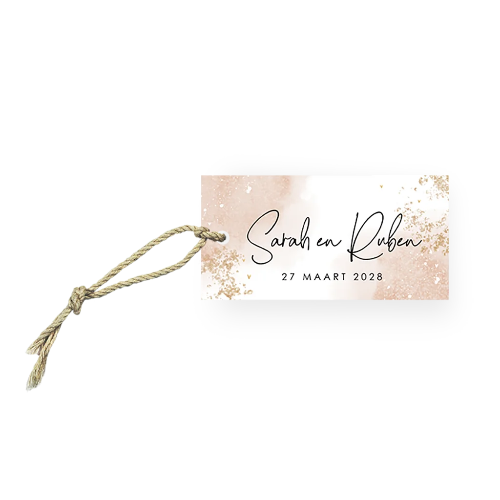 Hoe gaaf zijn labels voor jullie trouwbedankjes in de stijl van jullie trouwkaart? Vertaal het ontwerp door naar deze speciale bedankjes en laat alles met elkaar matchen. Bewerk de liggende rechthoekige labeltjes met boorgaatje gemakkelijk in de editor. Thuis hoef je ze enkel nog aan een leuk item zoals een zeepje, kaarsje of potje te bevestigen met passend bevestigingsmateriaal.
