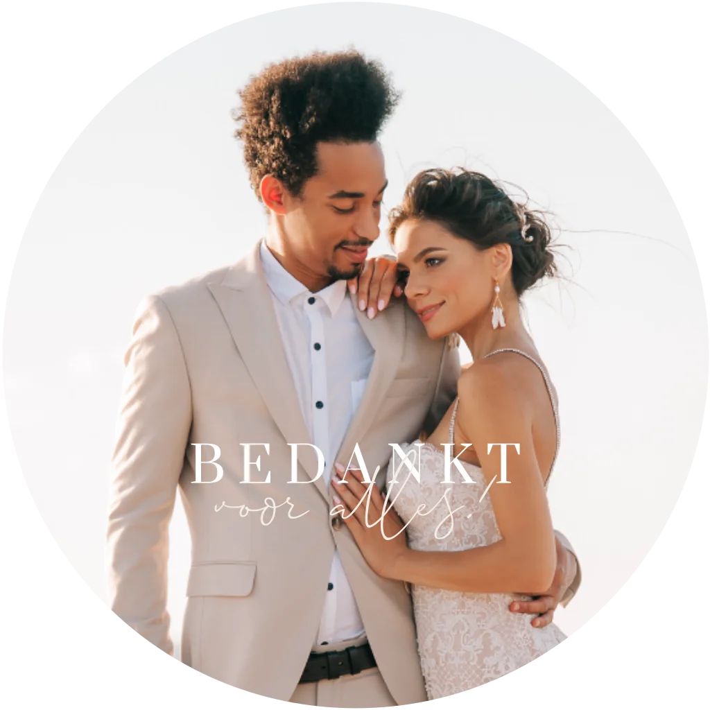 Bedank jullie gasten voor hun aanwezigheid met deze originele ronde bedankkaart! Kies een mooie foto van jullie bruiloft en maak de kaart zo helemaal eigen.