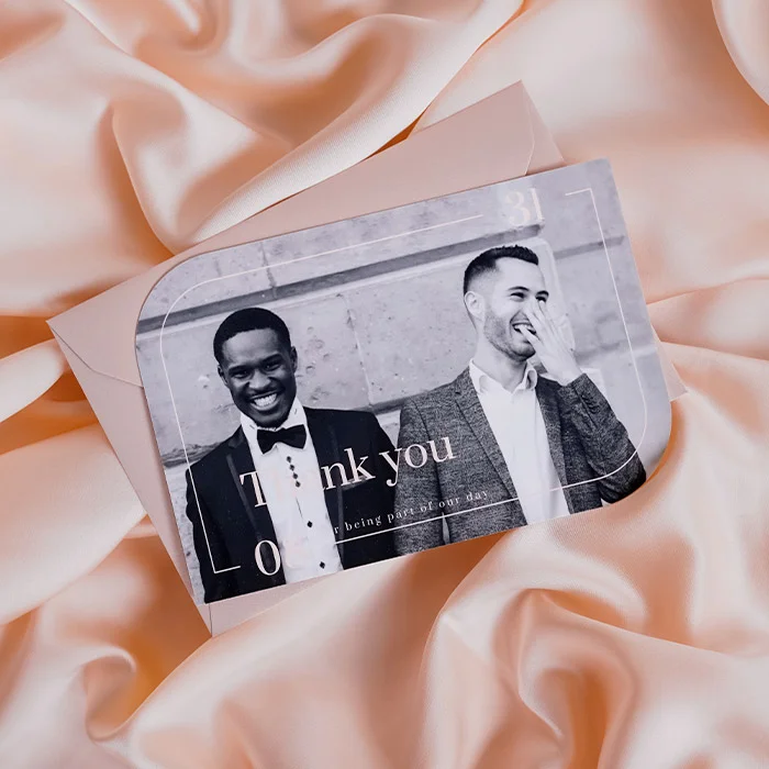 Een bedankkaart in een originele vorm is ontzettend gaaf om te versturen naar de gasten die op jullie bruiloft zijn geweest. Deze kaart heeft ruimte voor een eigen foto.