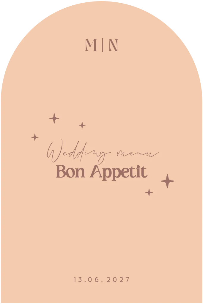 Op zoek naar een menukaart in originele vorm? Deze groovy menukaart in boogvorm maakt jullie bruidstafel helemaal af! Pas gemakkelijk de teksten, kleuren en andere elementen aan met de online editor.