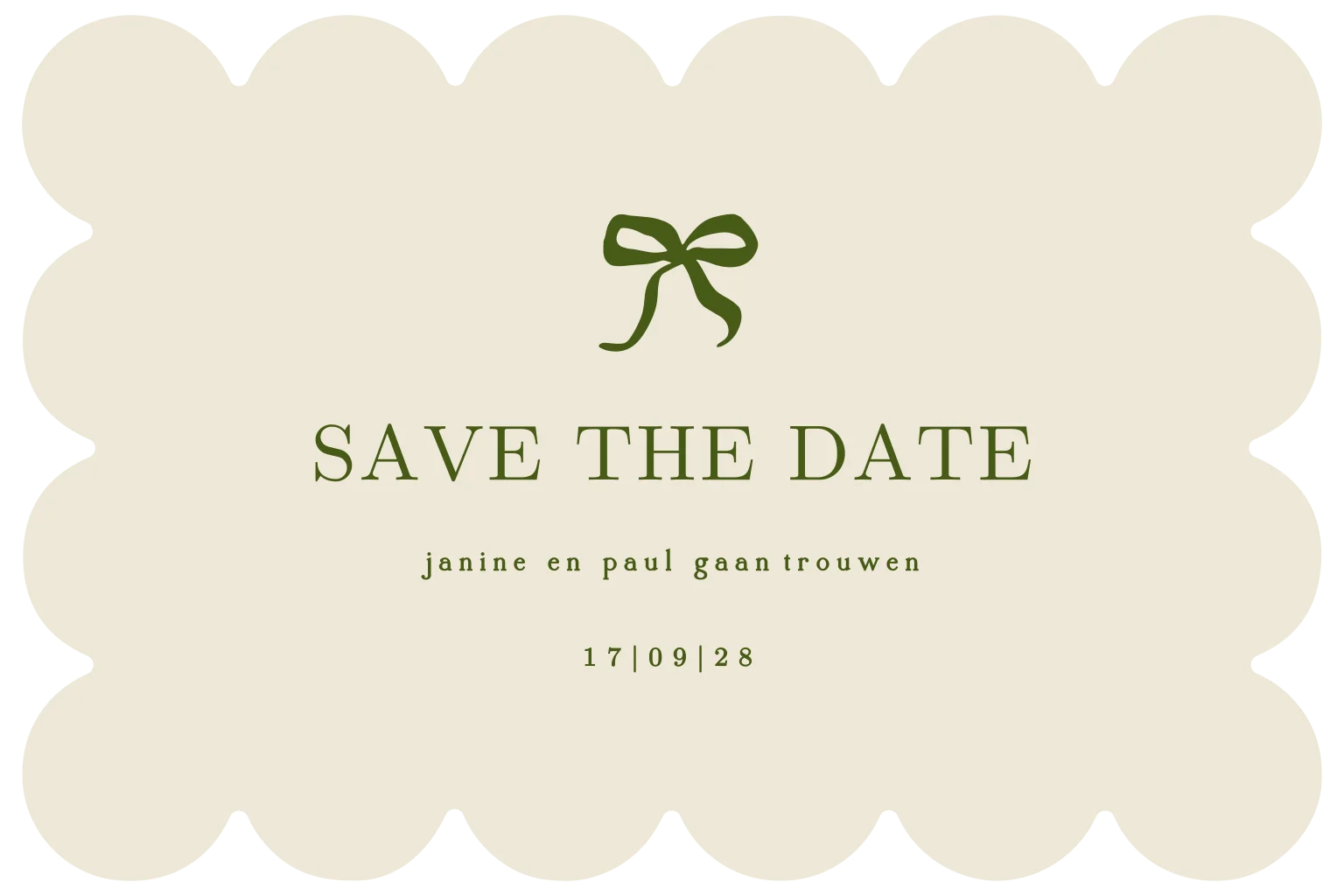 Nodig jullie gasten uit voor jullie bruiloft met deze originele groene save the date kaart met golvende randen! Pas kleuren, lettertypes en andere elementen gemakkelijk aan met de editor.