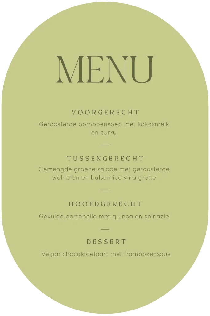 Bij een bijzondere bruiloft hoort een bijzondere menukaart! Deze stijlvolle menukaart in groen met olijftakjes maakt jullie bruidstafel helemaal af. Pas gemakkelijk de teksten, kleuren en lettertypes aan met de online editor.