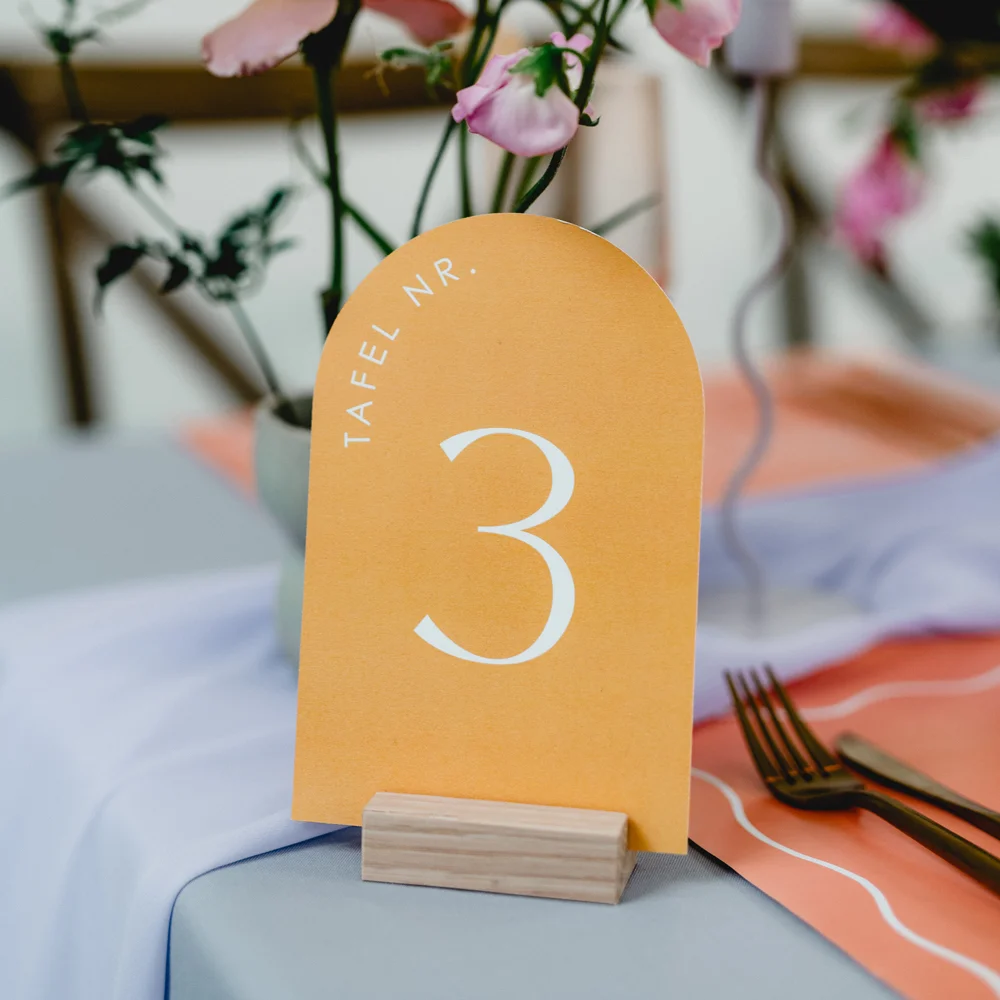 • Plaats de tafelkaart in een van onze houten kaarthouders en zet deze in het midden van de tafel. Zo is het nummer goed zichtbaar voor jullie gasten.