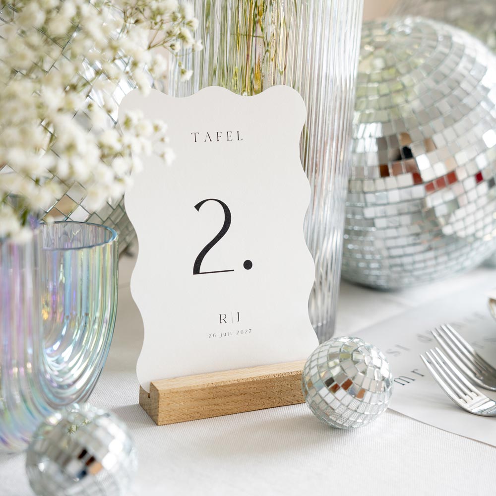 • Plaats de tafelkaart in een van onze houten kaarthouders en zet deze in het midden van de tafel. Zo is het nummer goed zichtbaar voor jullie gasten.