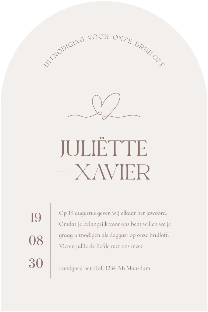 Jullie gaan trouwen! Reden voor een feestje. Nodig jullie gasten uit met dit prachtige trouwkaartje in boogvorm.