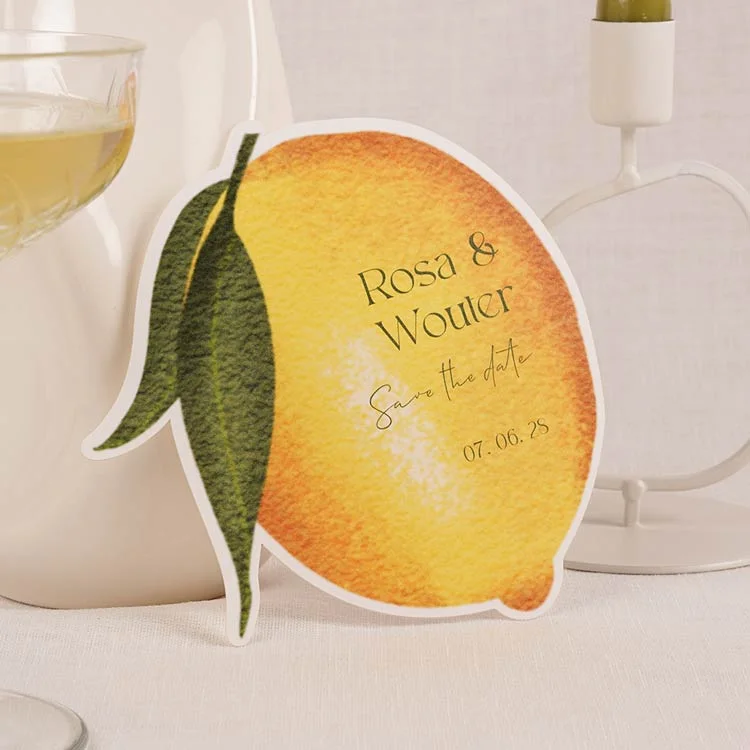Wat een pláátje, deze zomerse gestanste save the date kaart! Nodig jullie gasten uit voor jullie bruiloft met deze originele kaart in de vorm van een citroen. Zo kom je gelijk in zomerse sferen.