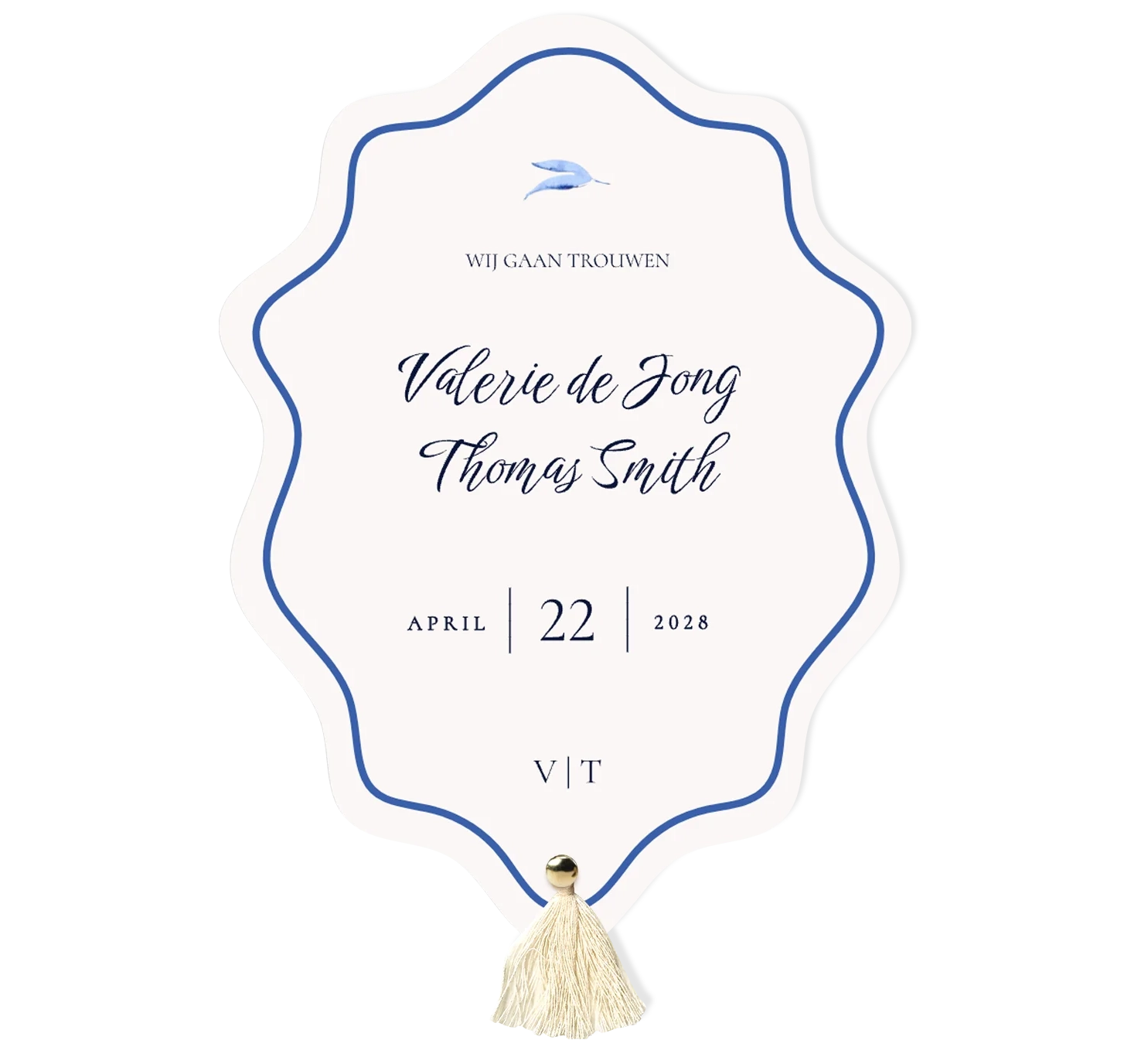 Wat een pláátje, deze prachtige gestanste trouwkaart! De kaart heeft aan de onderkant een perforatie waar je zelf een splitpen met kwastje kunt bevestigen. Zo leuk! Je kunt de splitpennen en kwastjes er los bijbestellen.