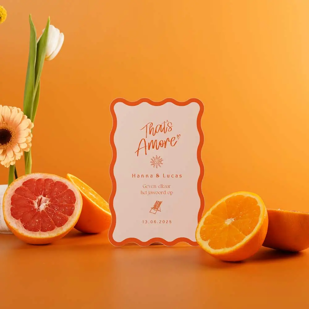 Deze Italiaanse trouwkaart is Amore op het eerste gezicht! Het golvende kader in combinatie met de zomerse illustraties maken dit de perfecte trouwkaart voor jullie Italiaanse bruiloft. Iets aanpassen? Dat doe je gemakkelijk in de online editor.