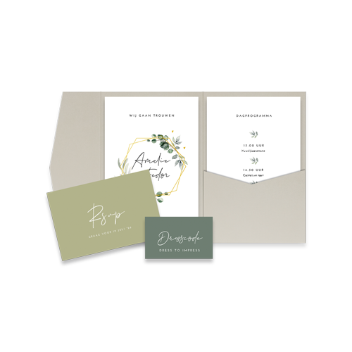 Good to know: houd er bij het verzenden van de pocketfolds rekening mee dat het pakketje wat zwaarder is dan normaal. Eén postzegel is waarschijnlijk niet voldoende. Check dit dus even bij je proefdruk!Plaats zelf de teksten en elementen eenvoudig op de juiste plek in onze opmaaktool. Heb je hier hulp bij nodig? Neem gerust even contact met ons op!