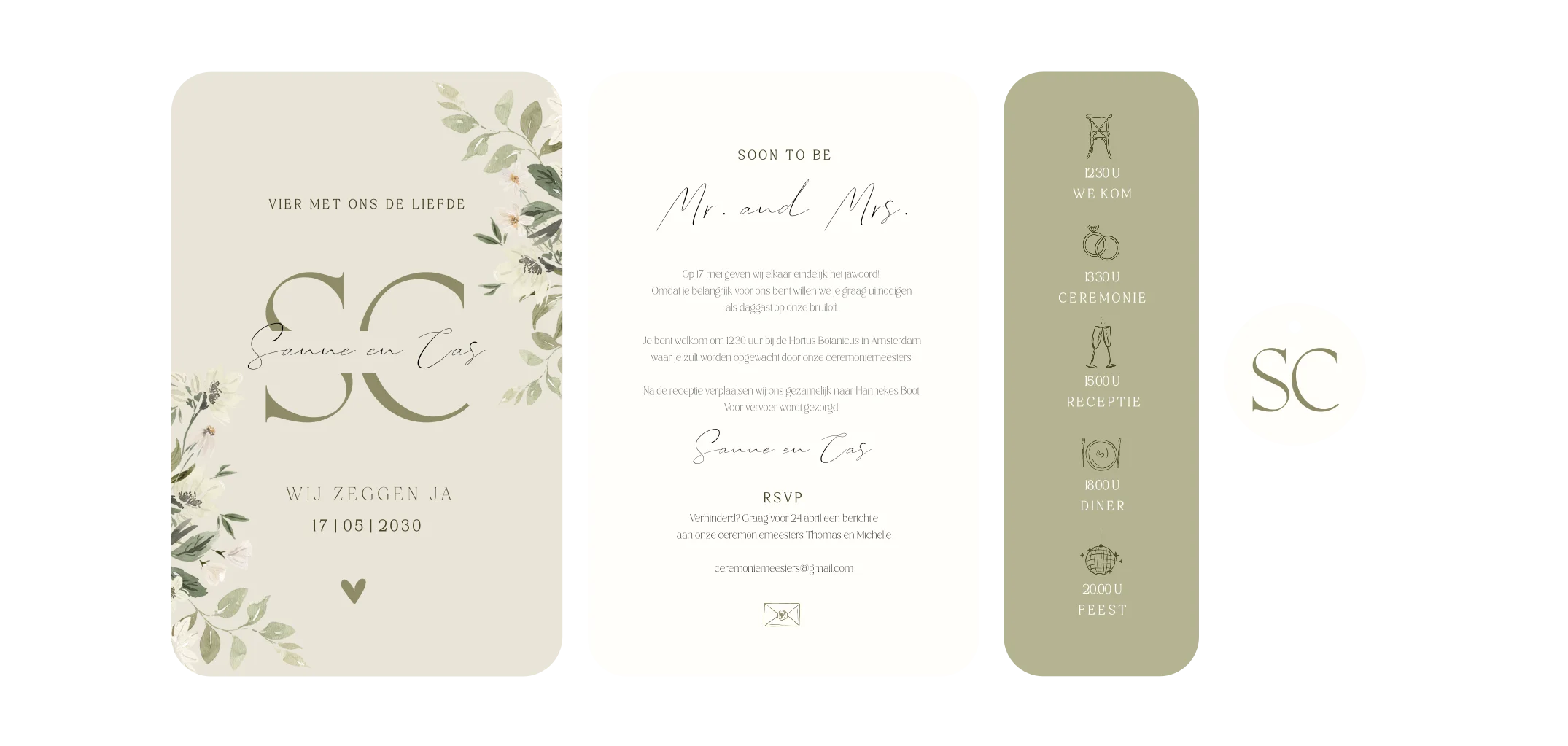 Elegante trouwkaart pocketfold in groen met initialen en bloemen